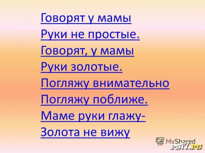В марте объявили о выставке работ мам. Ребята стали приносить рисунки, вязание, шитьё, творческие работы своих мамочек. Рассказывали о своей помощи. Многие девочки сами умелицы на все руки. Не зря можно каждому ребёнку сказать: " Говорят у мамы руки не простые". Дети и их матери довольны совместной деятельностью.
