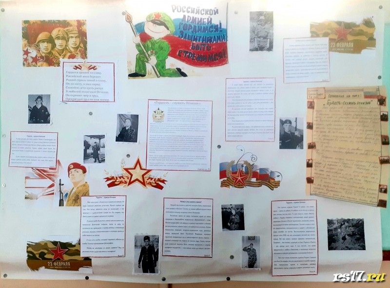 В рамках проведения декады предметов развивающего цикла, выпущена газета "Российской армией гордимся! Защитниками быть стремимся!". Для этой газеты учащиеся школы подготовили мини-сочинения по армейским рассказам их отцов и дедов, дополнили рассказ фотографиями, а также поделились своим мнениям о том, почему они хотят служить в рядах Российской армии.