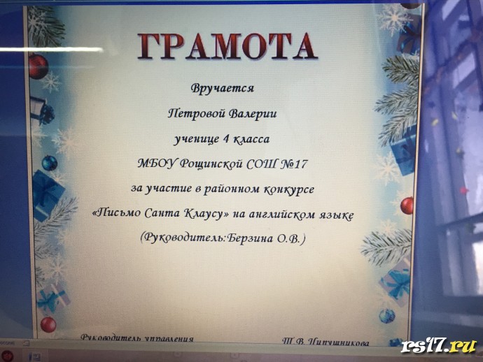 В районном конкурсе по английскому языку (25.12.2002) «Письмо Санта Клаусу» приняли участие ученицы 4 а класса Петрова Валерия, Березина Полина и Пустовалова Лидия (учитель Берзина О.В.) Все они получили грамоты участников.