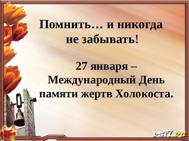 Холокост" в переводе с древнегреческого означает "всесожжение", "уничтожение огнем", "жертвоприношение". Впервые этот термин использовал лауреат Нобелевской премии мира писатель Эли Везель как символ газовых камер и крематориев лагерей уничтожения.1 ноября 2005 года Генеральная Ассамблея Организации Объединенных Наций приняла резолюцию, в которой она постановила, что день 27 января будет ежегодно отмечаться как Международный день памяти жертв Холокоста. В этот день весь цивилизованный мир склоняет голову перед жертвами варварских акций нацистов, ставших трагическим прологом Холокоста. Ученики 8Б класса подготовили презентацию и рассказали о большой трагедии под названием "ХОЛОКОСТ". Говорили о том что нужно и чего не нужно делать, чтобы не допустить повторения данного ужаса в мире. В презентации ребята могли увидеть весь ужас, испытанный взрослыми и детьми в лагерях смерти. Благодаря диалогу ребята смогли сделать вывод, что самым страшным преступлением против народа является ГЕНОЦИД