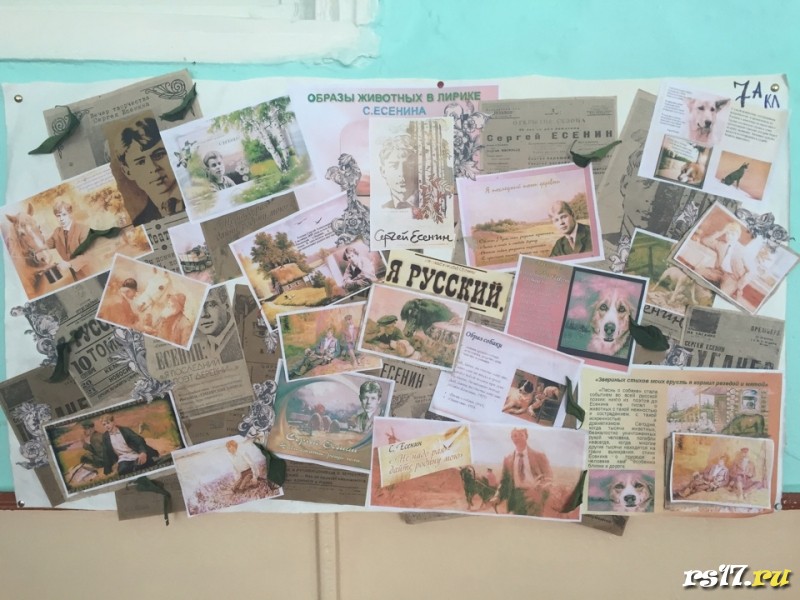 7а класс приняли активное участие в недели КТД "Без России не было б меня..."- посвященное 120 летию со дня рождения Сергея Есенина. Ребята сделали видео ролик на стихотворение С.Есенина Дай, Джин на счастье лапу мне.Режисер фильма Кожевников Никита. Читает стихотворения Тютюнников Виктор. В роли собаки выступает хаски Жеррар. Сьемка фильма прошла на одном дыхании три видеорепортера снимали с разных ракурсов, были и костюмеры и гримеры. Ребята подошли к работе с интересом и энтузиазмом поэтому и получился такой замечательный фильм.Ссылка на видео https://youtu.be/gZSLgReKteg. Также дети сделали коллаж посвященный Юбилею С.Есенина "Образы животных в лиреке С.Есенина. Коллаж получился яркий насыщенный информацией, который можно рассматривать и познавать.