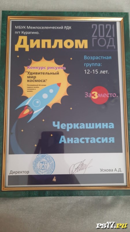 18.12.2021 году прошел заключительный этап районного конкурса «IT – палитра впечатлений», в целях реализации подпрограммы «Одарённые дети» муниципальной программы «Развитие образования Курагинского района», По итогам экспертизы творческих работ, поступивших для участия в Конкурсе на тему: «Космические фантазии» определяются победители Черкашина Анастасия, заняла 3 место номинации «Мастер графики». Получили сертификаты участников: Косточка Олеся, Есякова Ксенья, Сморкалова Арина, Кочергина Анастасия, Барахтенко Кристина.